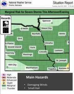 Scattered thunderstorms are expected to develop over northeast Nebraska by 2 to 3 pm, with that activity moving rapidly east and southeast across the area through 7 pm this evening.
