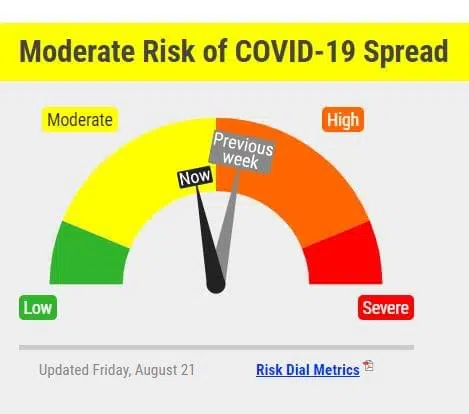 The COVID-19 Risk Dial is at “Yellow,” indicating a moderate risk of the virus spreading. Residents are advised to follow these recommendations to protect themselves and others: