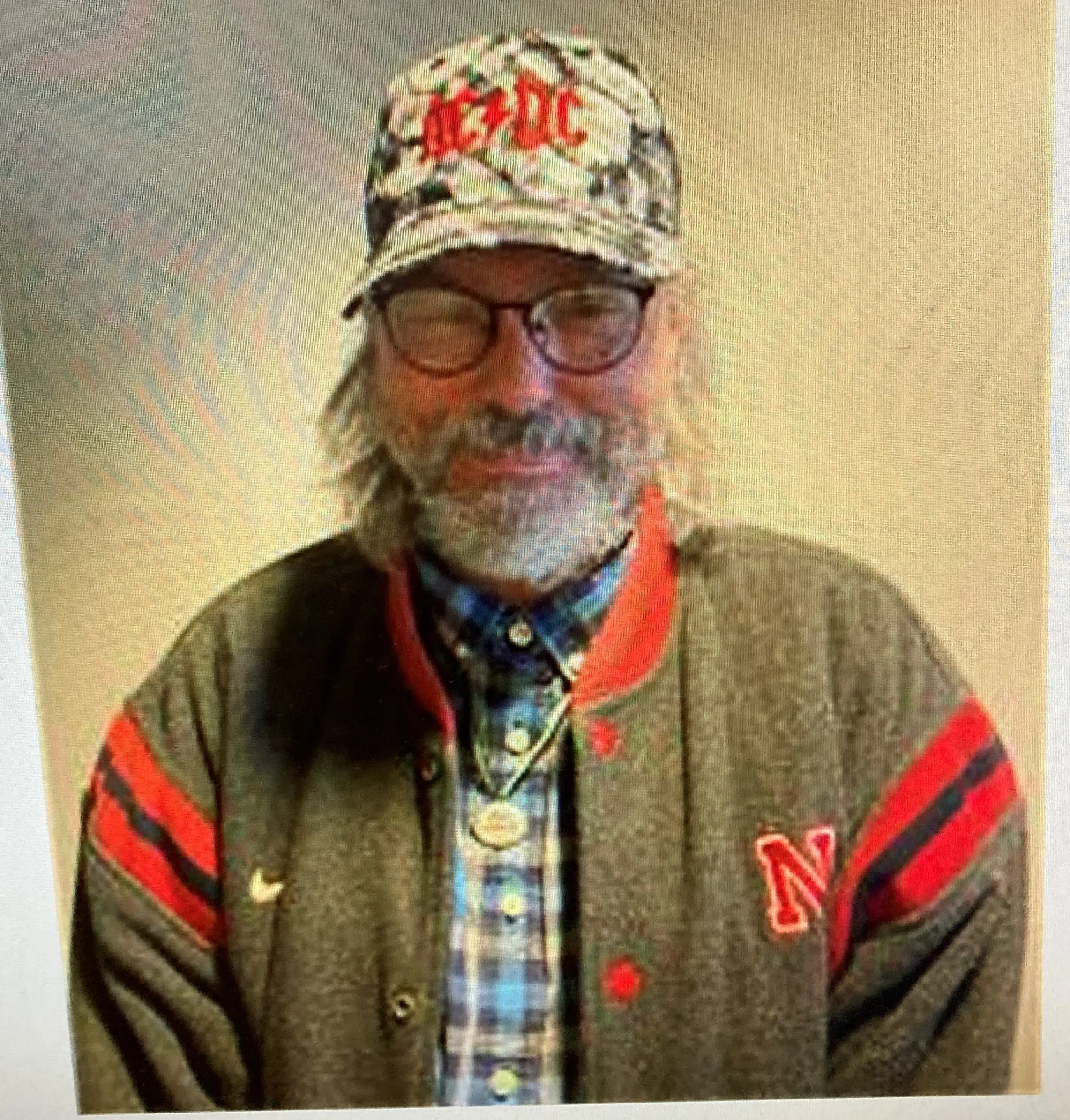 He is possibly wearing a grey University of Nebraska letterman jacket, and a Nebraska baseball cap with a large “N” on it. He is under court order and potentially dangerous.