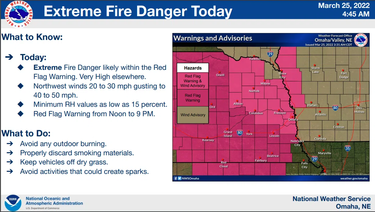 A Red Flag Warning is in effect for most of eastern Nebraska and parts of western Iowa from Noon through 9 PM.
