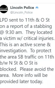 Update: The Lincoln Police Department is investigating a stabbing that occurred at 11th and ‘N’ Street on Friday. Officers responding to the call at 9:30 a.m. of a stabbing and discovered a 37-year-old Lincoln man with critical injuries. The man was taken to a local hospital and his injuries were determined to be life-threatening. He currently remains hospitalized.