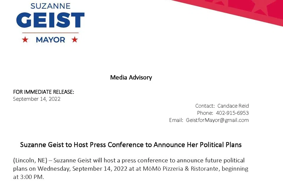 State Senator Suzanne Geist has scheduled a news conference for 3pm this afternoon to announce she is a candidate for Mayor for the City of Lincoln.