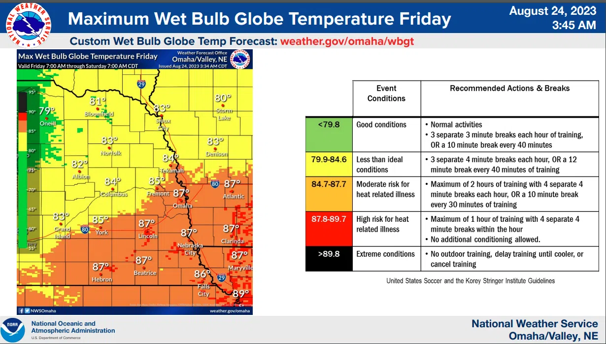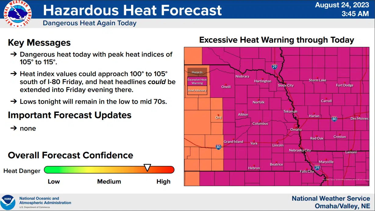 Dangerous heat could persist for many into Friday as well, especially across southeast Nebraska and southwest Iowa. Temperatures are forecast to return to seasonal norms for the weekend with highs Saturday and Sunday in the mid 80s.