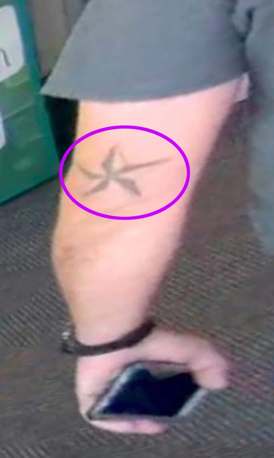 The suspect was seen to have star tattoos on the back of both arms above the elbows, a heart tattoo on his left hand, and large tattoos on both forearms.