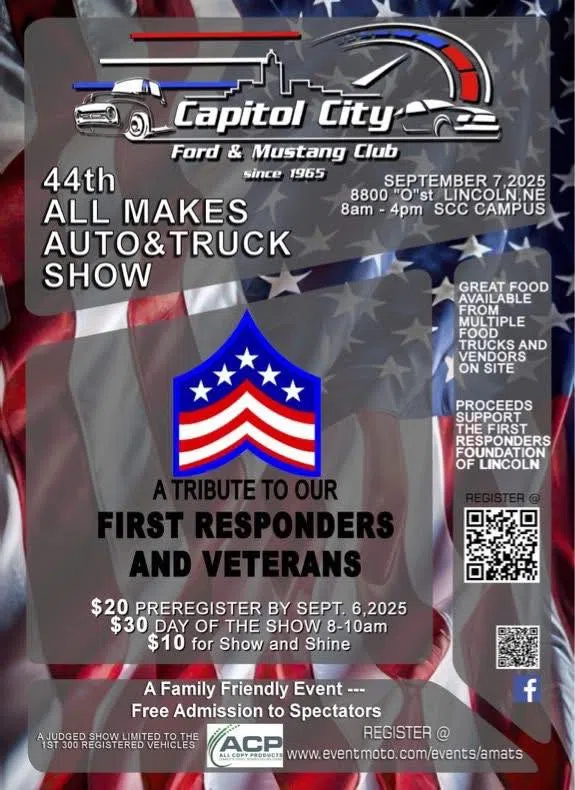 The family-friendly event features more than 60 judged classes, food trucks, children’s activities, raffles, and specialty displays including a Lancaster County Sheriff’s SWAT vehicle and a race car from the Unser Collection at the Museum of American Speed. Proceeds benefit the Lincoln chapter of the First Responders Foundation. Last year, the show raised $15,000 for the charity.