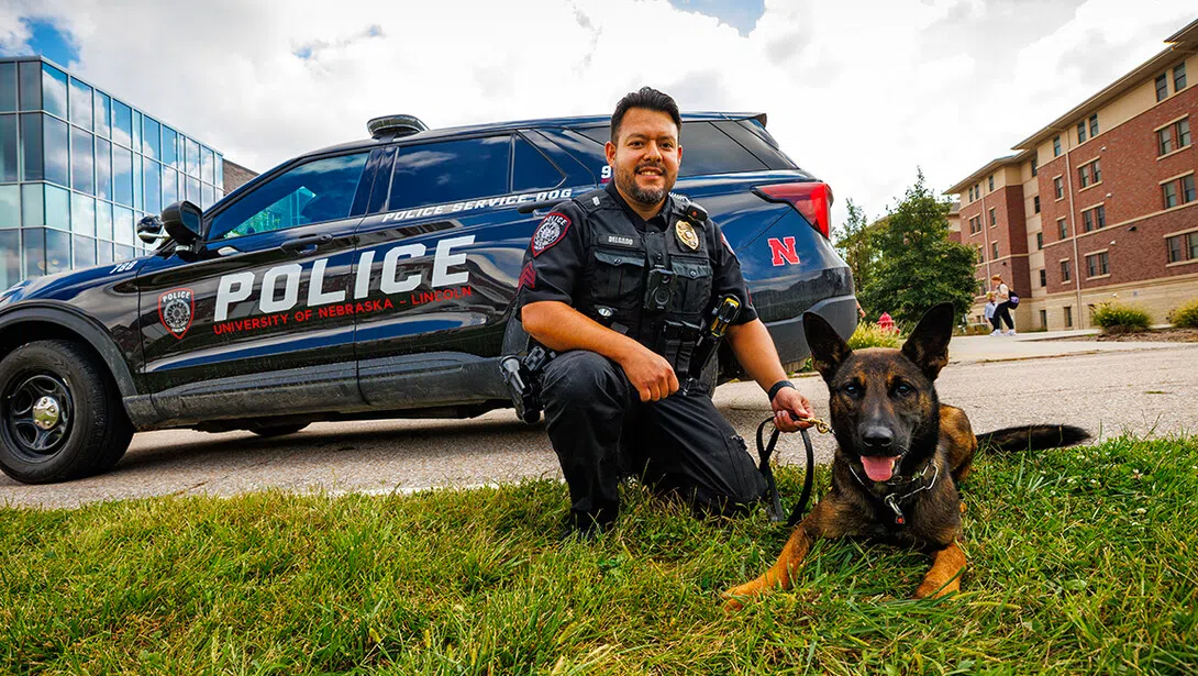 Sgt. Anderson Delgado poses with Dodger, UNLPD's newest K-9 officer. (Kristen Labadie | University Communication and Marketing)