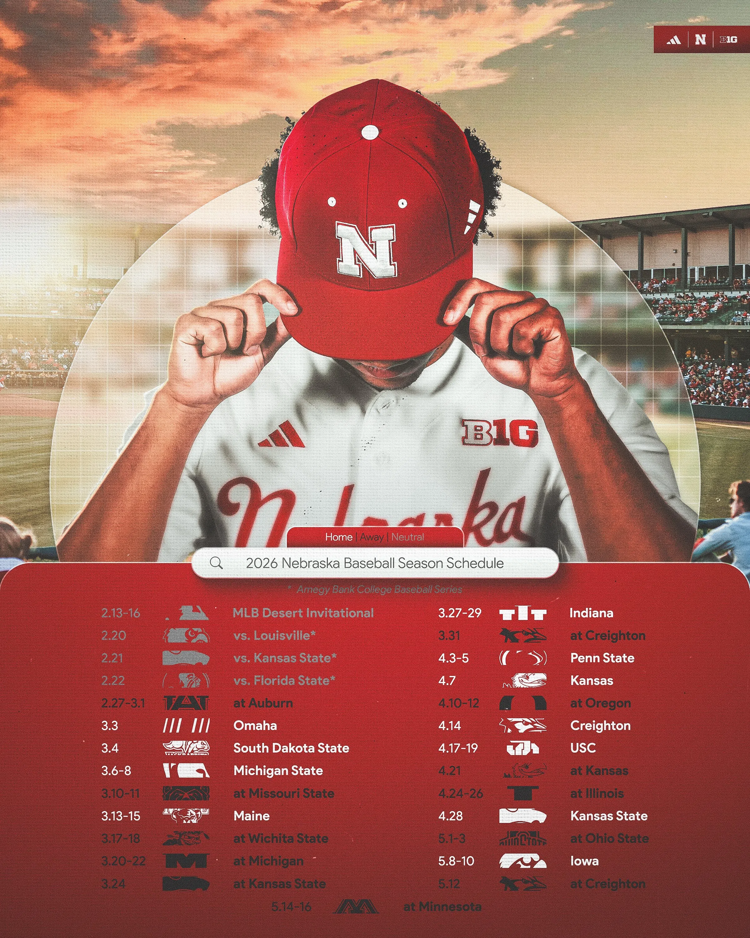 Nebraska will start the season in Scottsdale, Ariz., at the MLB Desert Invitational Feb. 13-16, but start times and opponents will be announced at a later date. The home opener is March 3 against Omaha, with Big Ten play starting March 6-8 with a home series against Michigan State. The Huskers will also face Michigan, Indiana, Penn State, Oregon, USC, Illinois, Ohio State, Iowa and Minnesota in conference play.