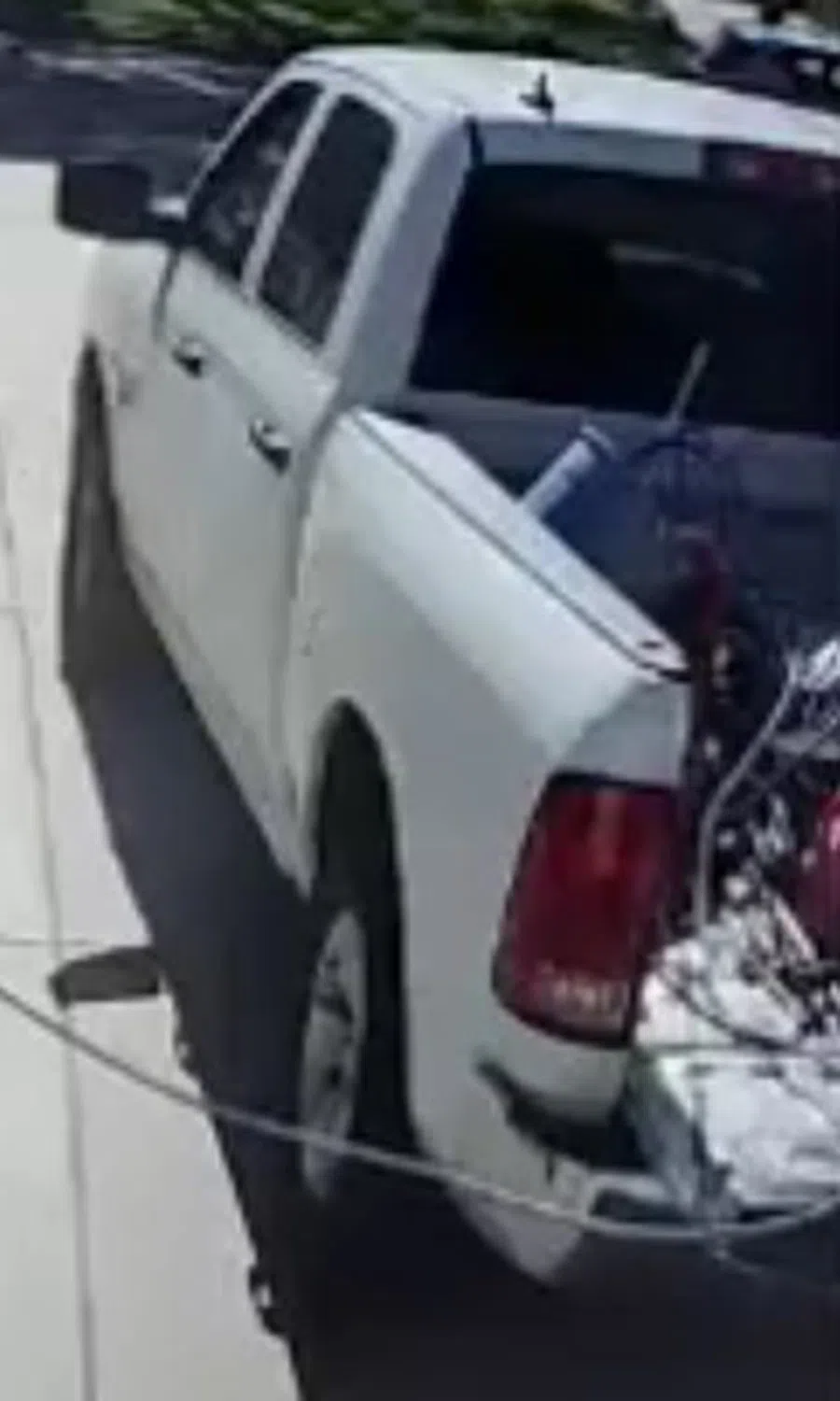 Two individuals were captured on video walking on the sidewalk, one of them with a black cutoff shirt and a guitar.