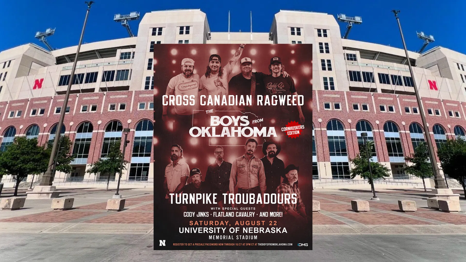 Cross Canadian Ragweed and Turnpike Troubadours will bring The Boys From Oklahoma Tour to Memorial Stadium on the University of Nebraska–Lincoln campus Saturday, August 22, 2026.