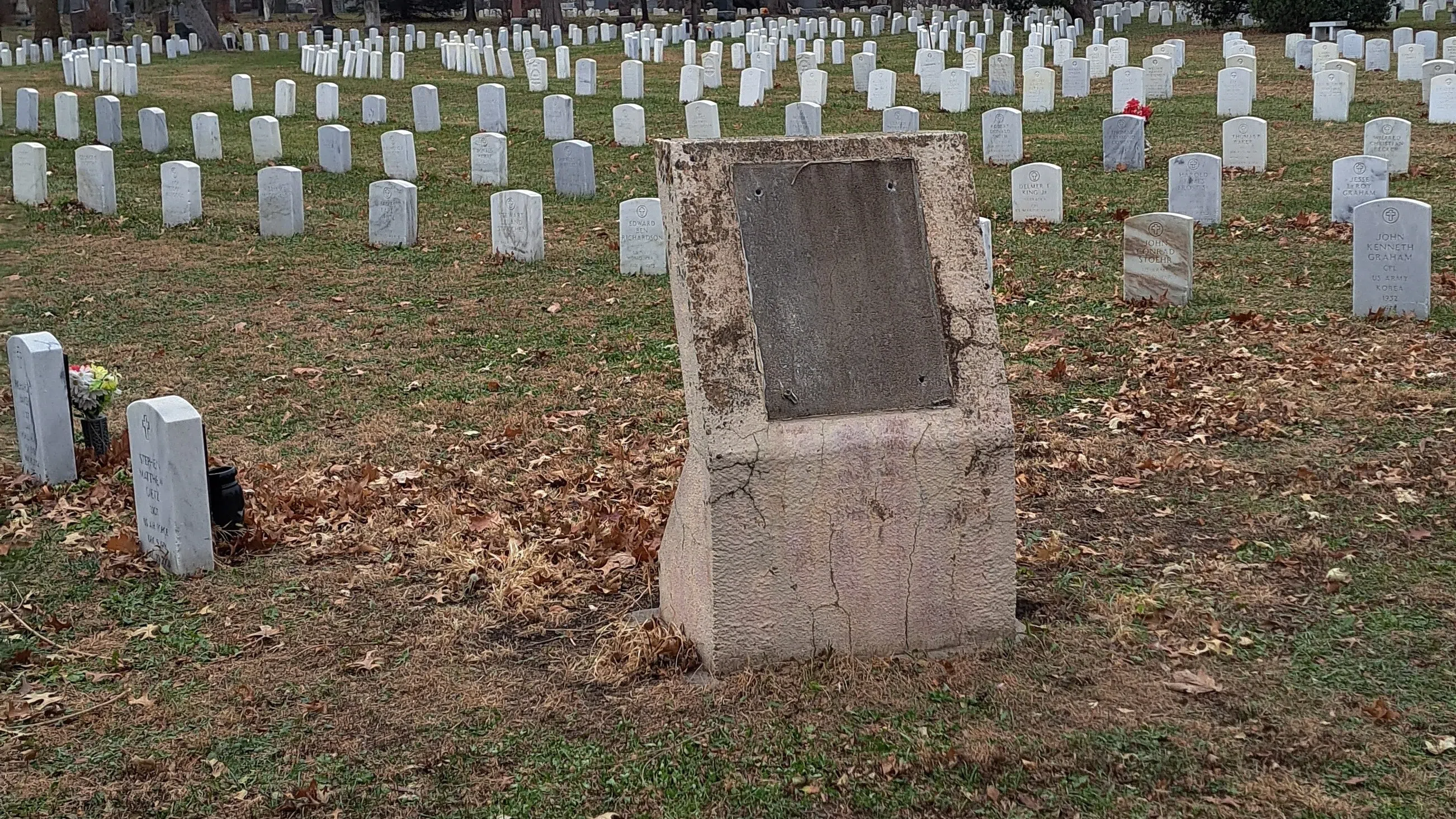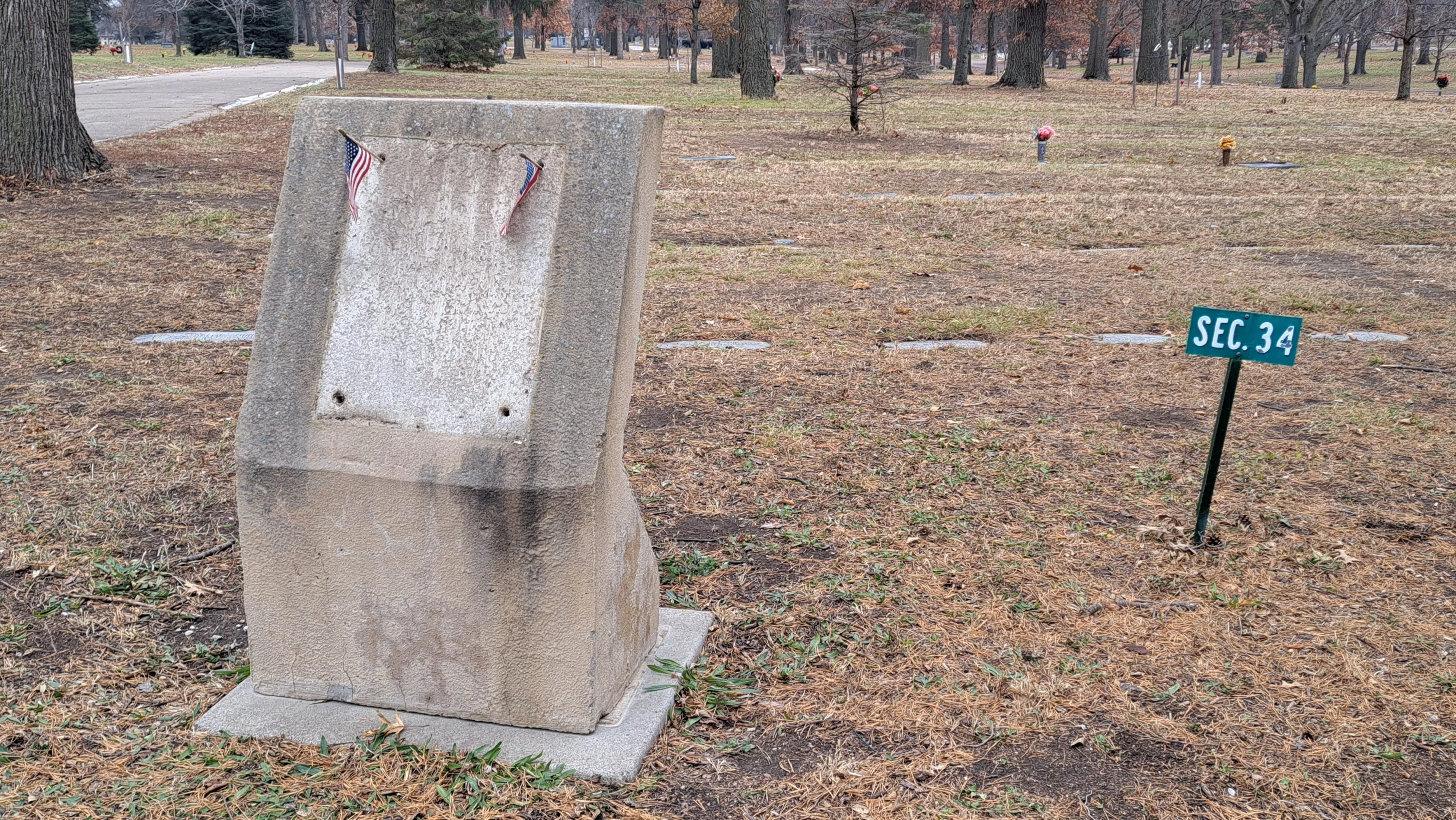 The site of Former Nebraska Gov. Albinus Nance's bust at Lincoln's Wyuka Cemetery, vandalized and stolen in the evening on Wednesday, Dec. 11, 2025 (Photo: Chris Lofgreen, KLIN News)