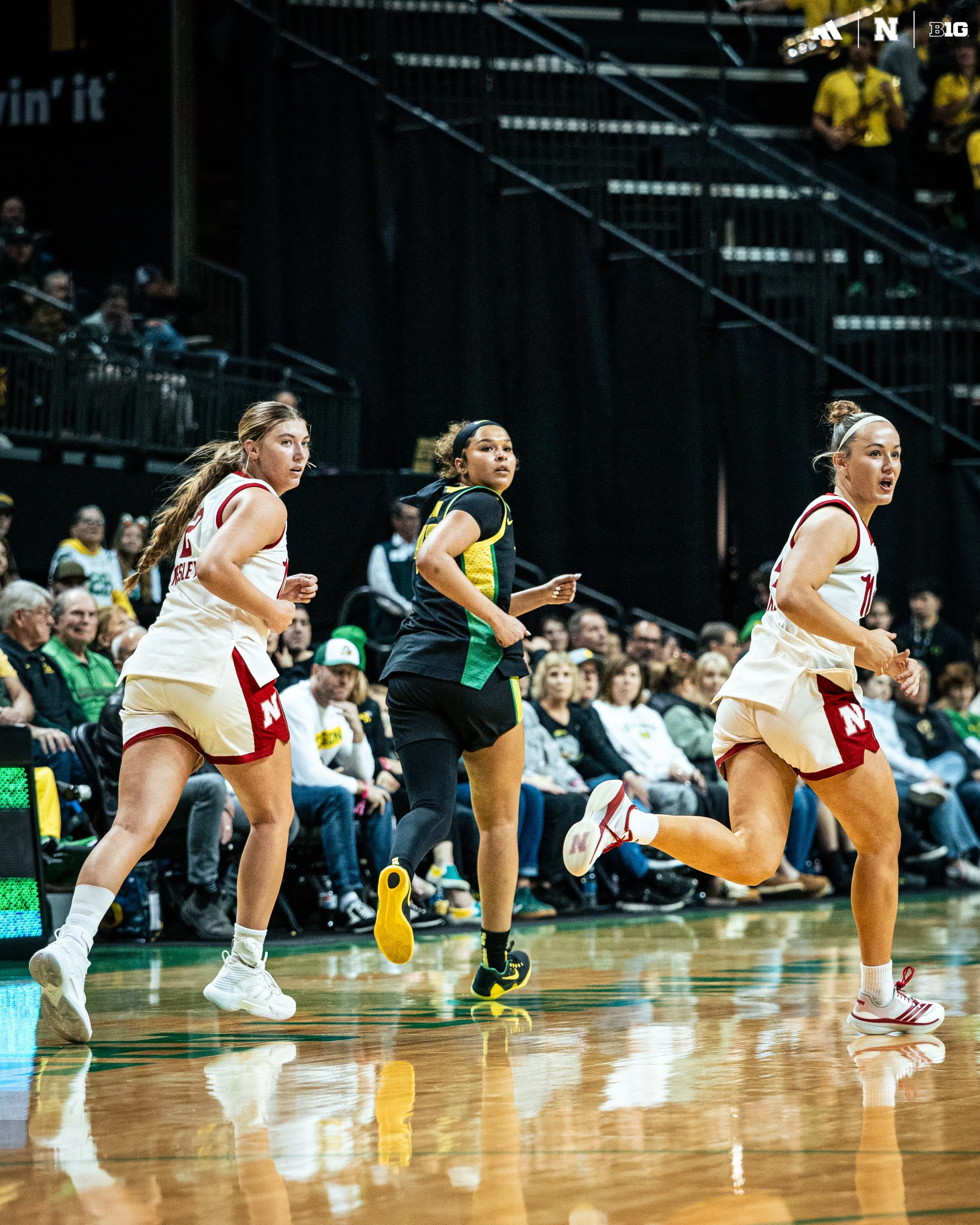 Oregon grabbed a 10-2 run in the middle of the first quarter, opening a 15-8 lead with 6:13 to go in the first. The Ducks led from there until a 5-0 run in the final two minutes of the quarter by Nebraska, tying the game at 20 through one quarter. The Huskers started the second quarter on a 6-0 run, taking a 26-20 lead with just under eight minutes to go in the half. Prince had four of the six points during the streak. A 5-0 NU run late in the quarter built a 37-26 lead with two minutes remaining in the half, but Oregon ended the half on a 7-0 run to shrink the Huskers’ advantage to 37-33 at halftime.