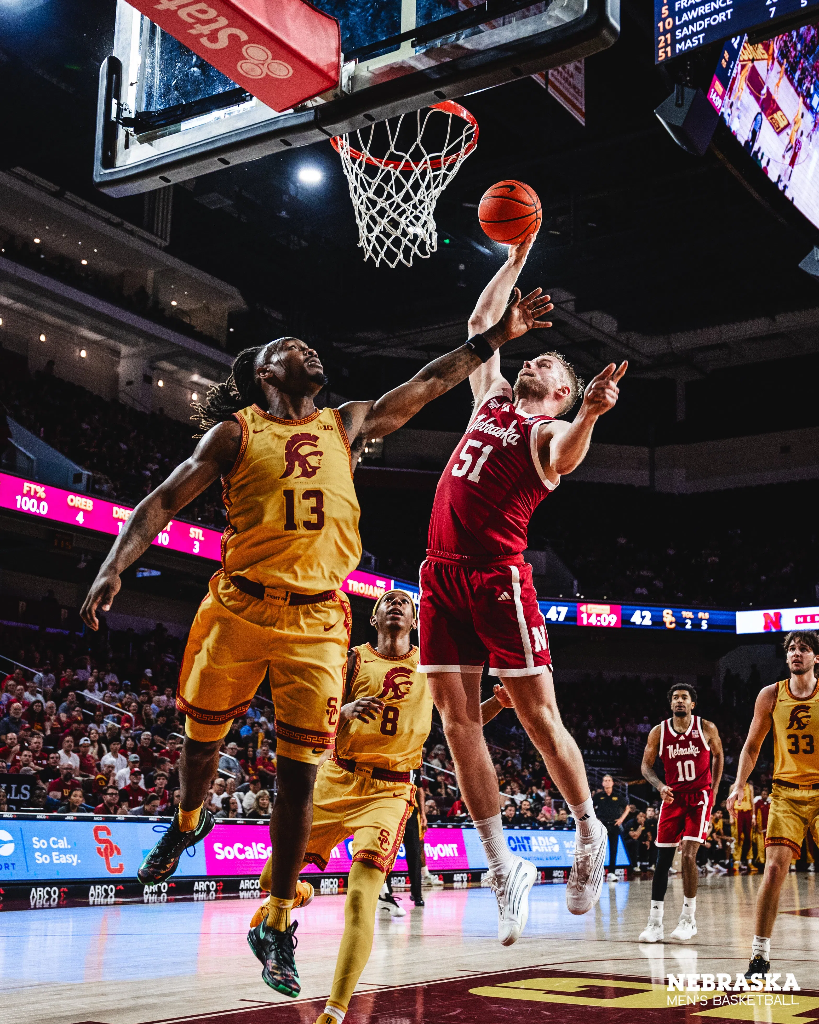 USC led by as many as seven in the first half. But a Pryce Sandfort layup late in the first half sparked a 14-2 run, and Nebraska had take a 43-38 lead with 17 minutes to play. A 15-0 run in the middle of the second half opened the Huskers’ advantage to 66-46 with 8:46 to play and all but doomed the Trojans. Nebraska led by at least 12 points the rest of the way.