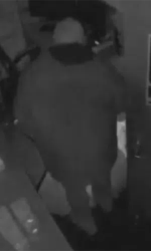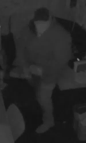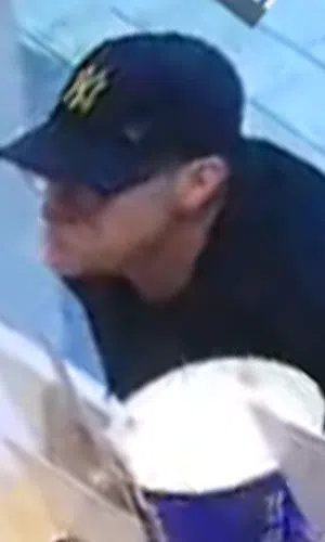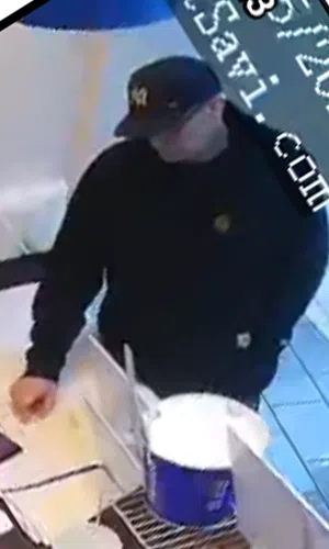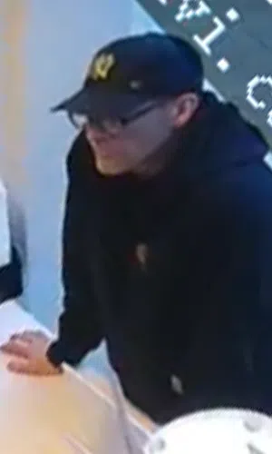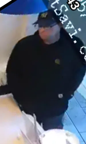 The suspect is described as a white male in his 30’s or 40’s, wearing a ball cap, glasses, and a hoodie with a design on the left chest area.