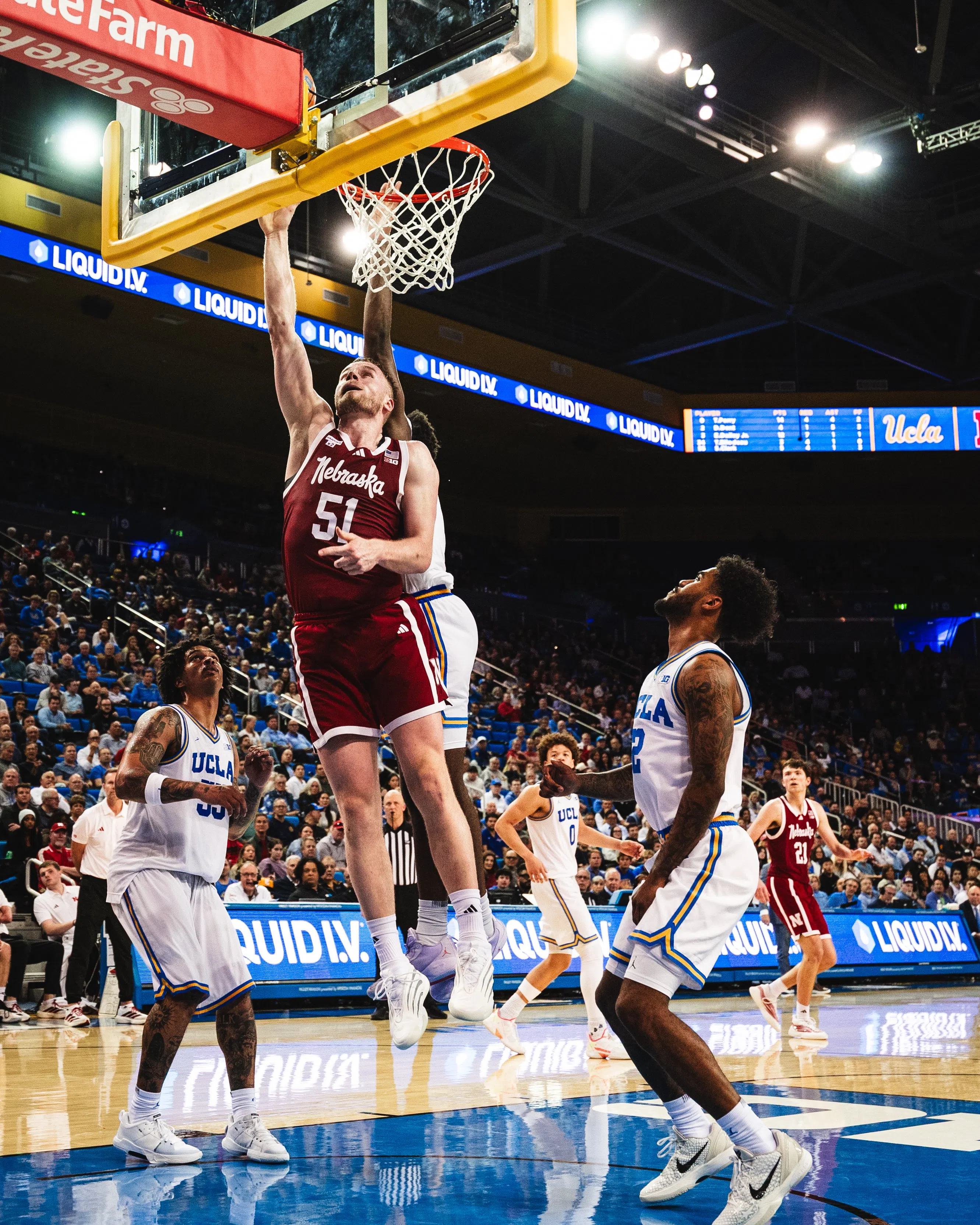 Nebraska struggled to hit shots, especially from the perimeter. The Huskers were 5-for-24 (20.8 percent) from behind the arc. NU started the game shooting poorly, hitting just 9-of-29 (31 percent) from the field. Sam Hoiberg led the Huskers with 12 points, while Rienk Mast and Cale Jacobsen each tallied 11. Pryce Sandfort, the reigning Big Ten co-Player of the Week, was held to just nine points. Trent Perry led the Bruins with 20 points on 8-for-15 shooting, while Eric Bailey, Jr., contributed 14 points and eight rebounds. UCLA was able tough on the boards, converting 11 offensive rebounds into 17 second-chance points, compared to just seven second-chance points for NU.