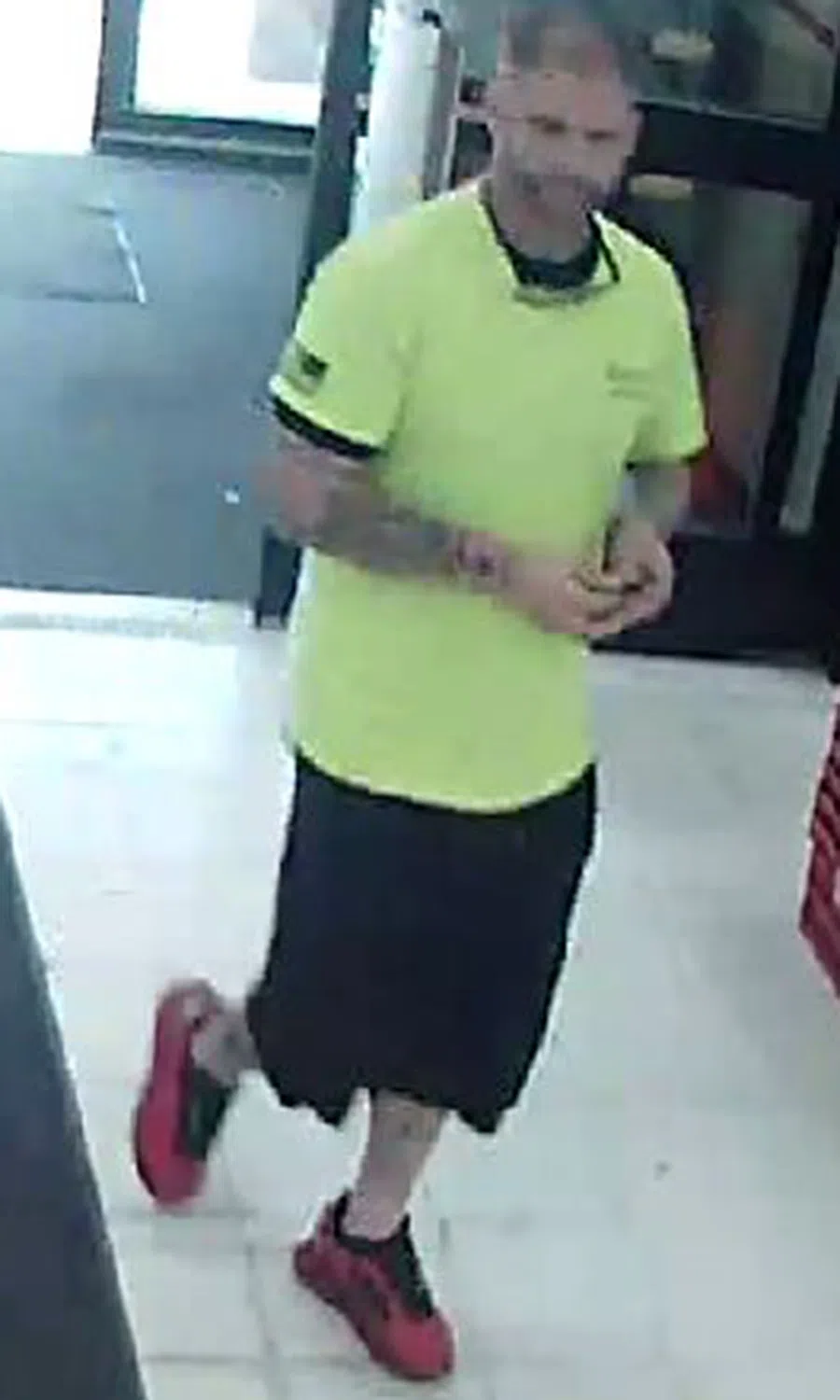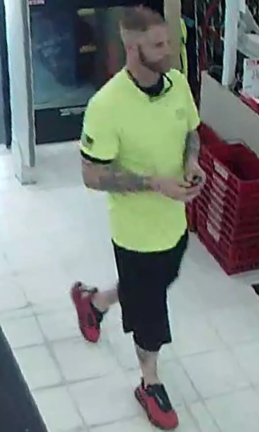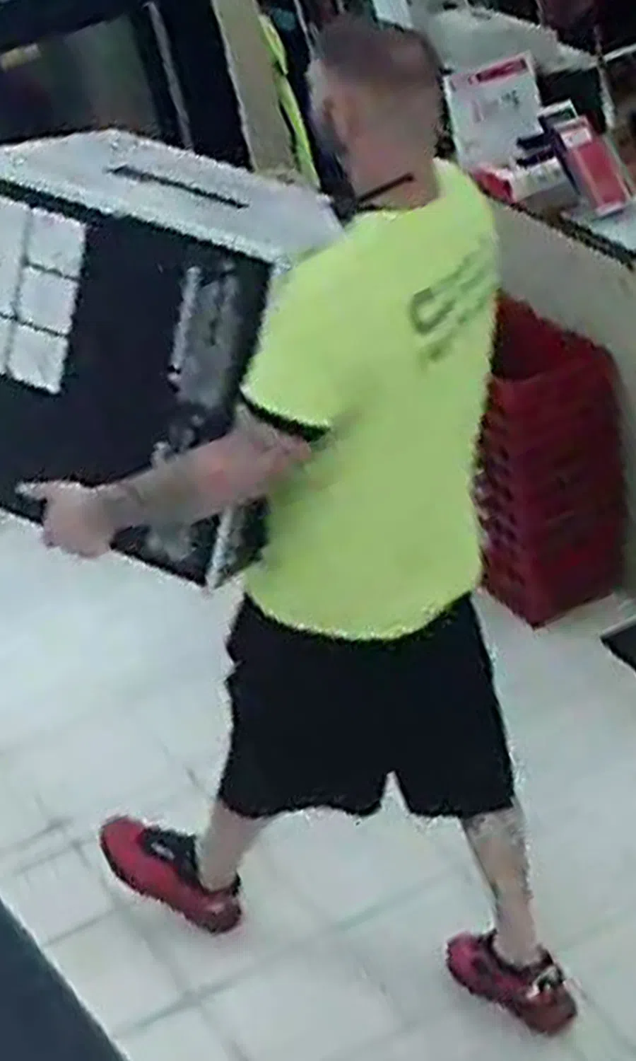 The particular suspect who stole the printer was described as a white male in a neon yellow shirt. The other male was described as a Hispanic male with a long pony tail and a goatee. Both men have several tattoos on their arms and legs.